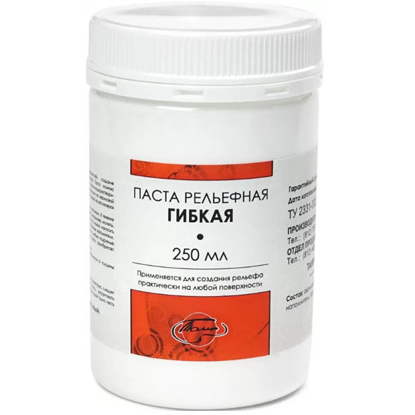 Высохшая гибкая рельефная паста имеет гладкую «пластиковую» поверхность и обладает умеренной пластичностью.