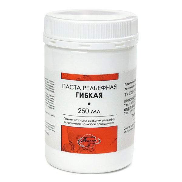 Гибкая рельефная паста предназначена для создания рельефа в первую очередь на гибких, таких как, холст или кожа, поверхностях.