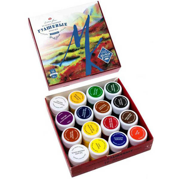 Художественная высококачественная гуашь изготавливается из тонкотертых пигментов и связующего с добавлением гуммиарабика.