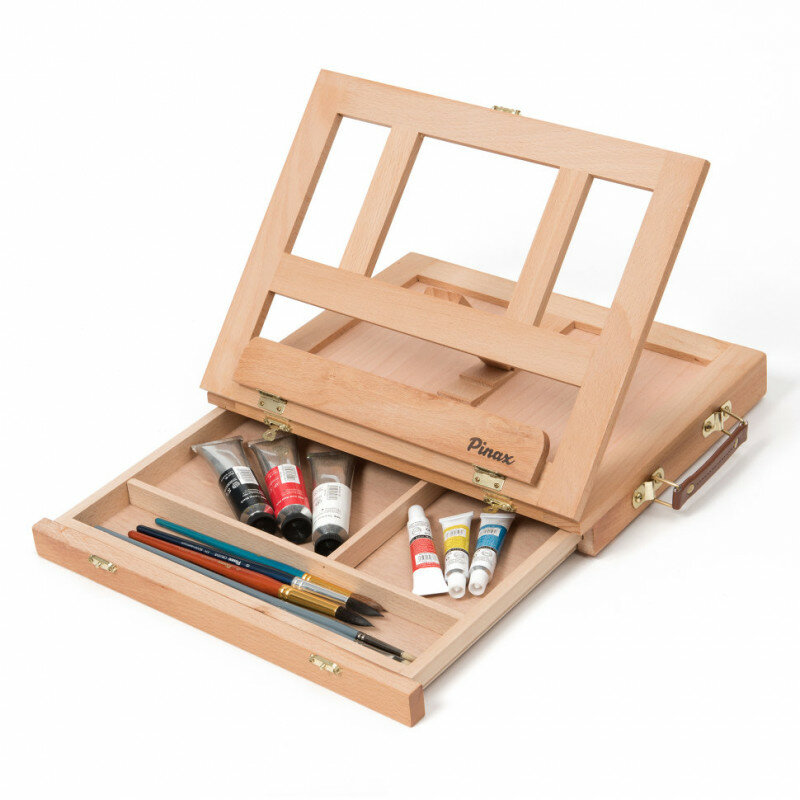 Настольный каркасный мольберт с ящиком для кисте й и красок "Pinax" изготовлен из высококачественного европейского бука, который известен своими прекрасными эксплуатационными свойствами.