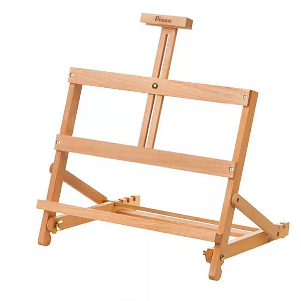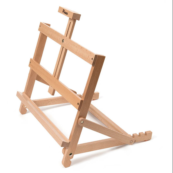 Небольшой настольный мольберт с изменяемым наклоном верхней рамы и подвижным фиксатором холста/планшета.