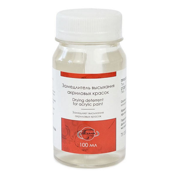 При смешивании с акриловыми красками замедлитель затормаживает высыхание плёнки, что является важным условием для более длительной сохранности красок на палитре и более длительного времени их применения.